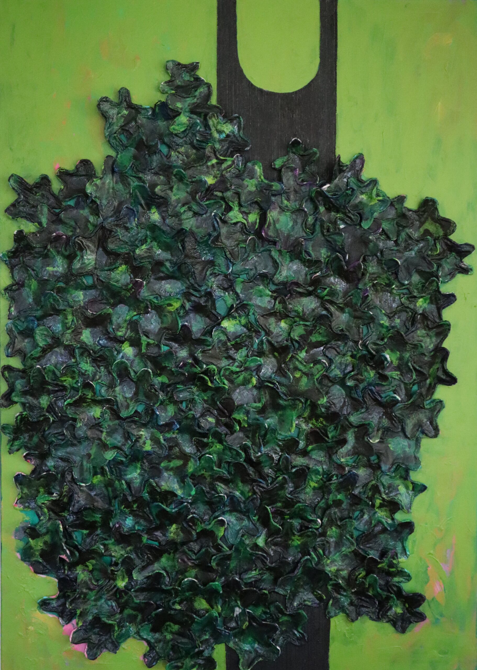 Alle Arbeiten sind auf Leinen gemalt. Mit Acryl vielschichtig strukturiert und getrocknet. Die Fläche wird in 1000 Streifen geschnitten: dünne, dicke, lange, kurze. Auf der Leinwand werden diese Streifen collagiert. So entstehen Farbflächen.